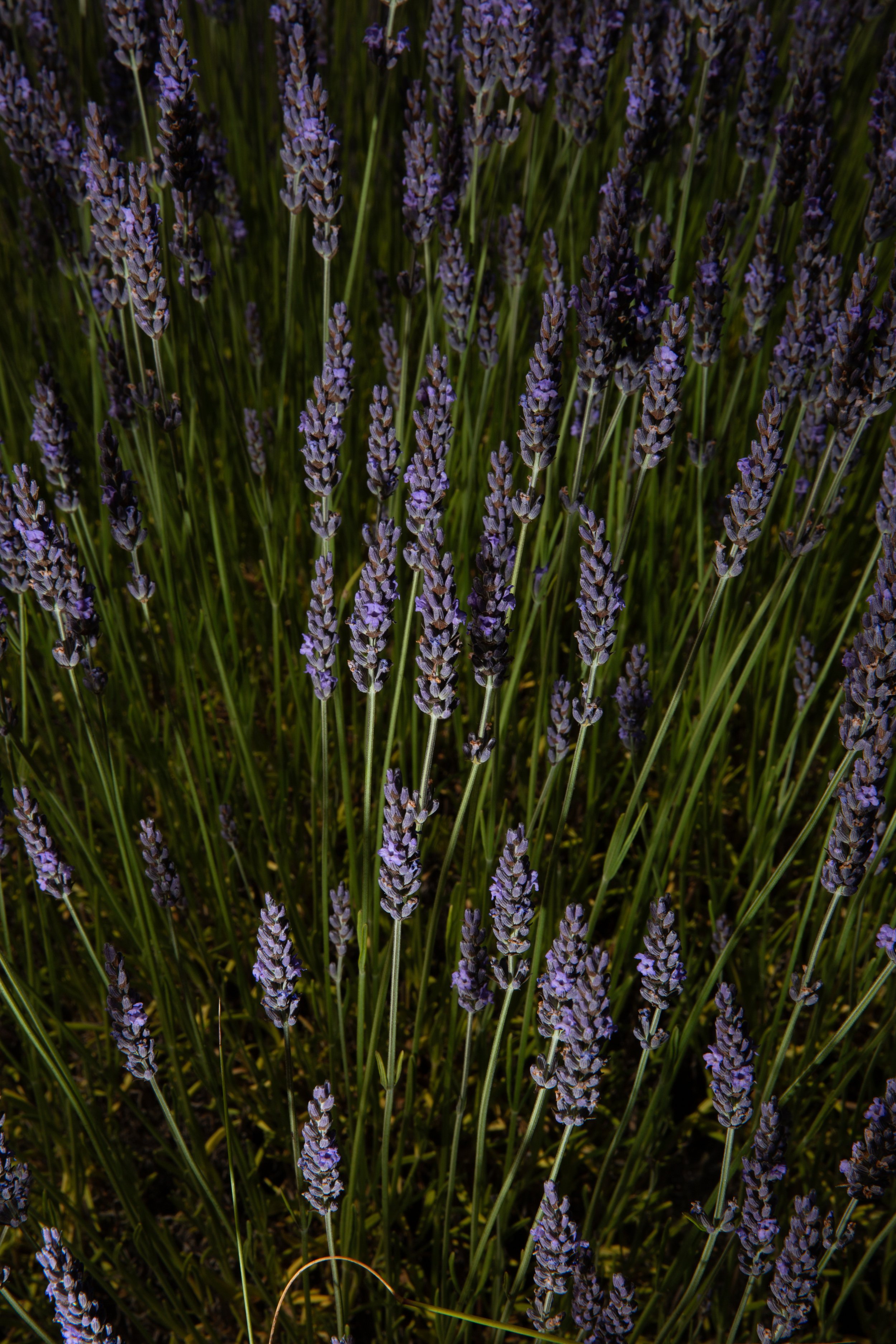 Close-up of blooming lavender flowers with purple petals and green stems. View fullsize