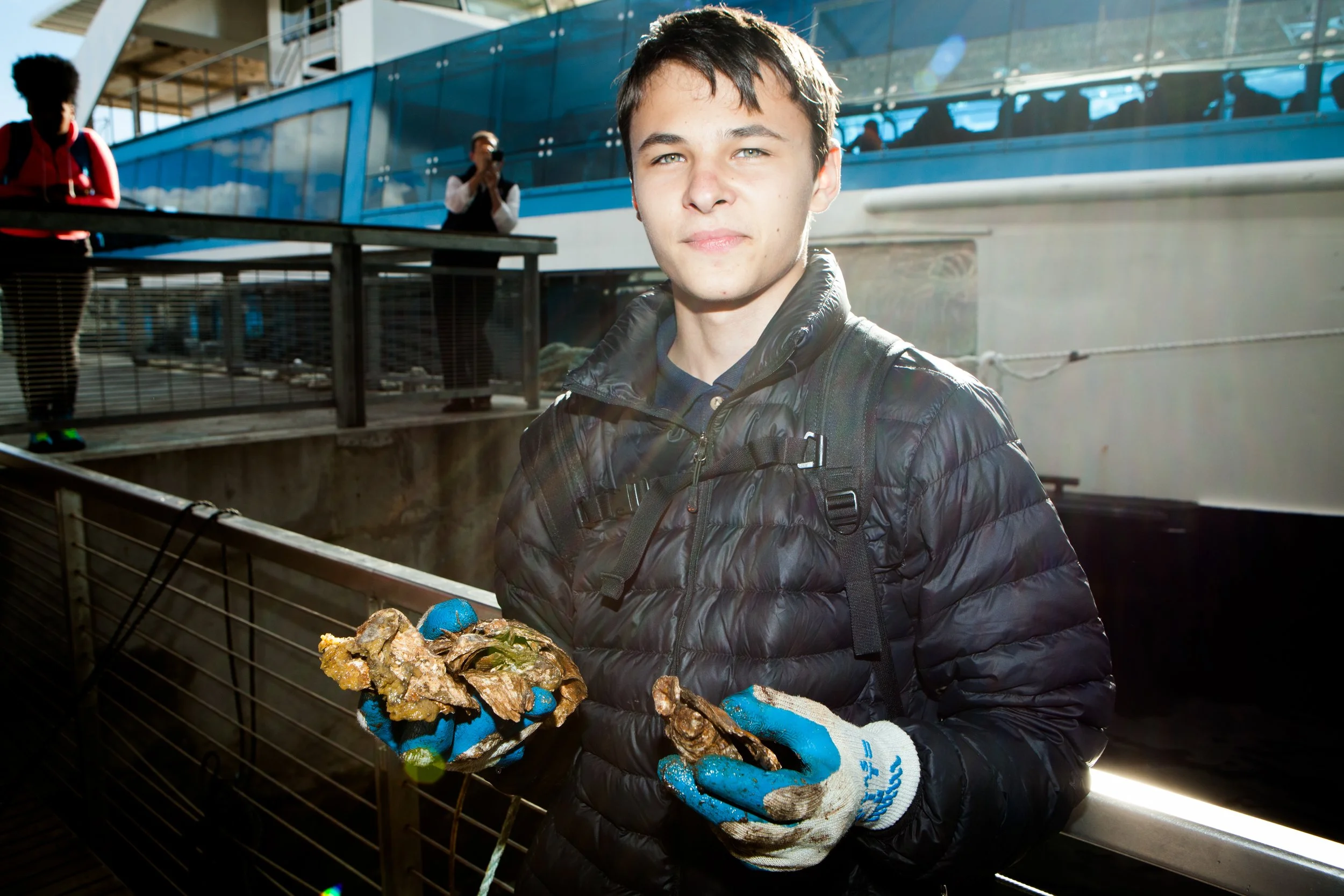 Young man in a black jacket and white gloves holding washed oysters on a boat dock.